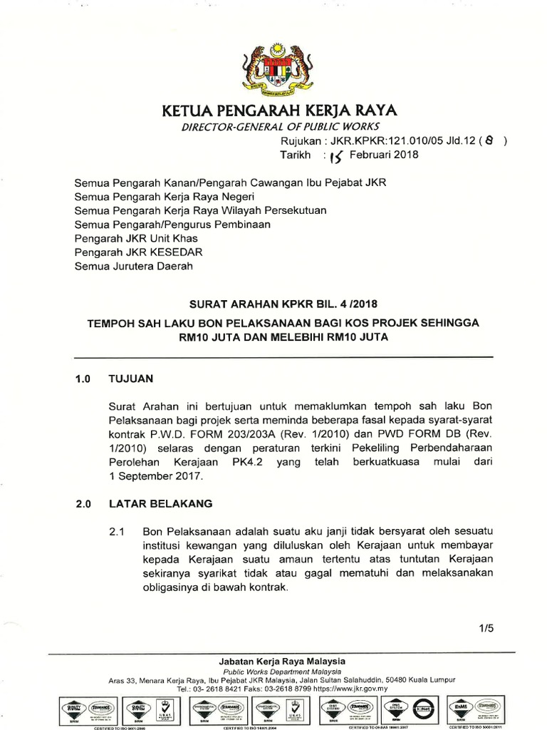 Sekiranya kontraktor tidak dapat mengemukakan Bon Pelaksanaan bagi kontrak kerja kaedah Wang Jaminan Pelaksanaan WJP hendaklah diguna pakai dengan kadar yang sama. Wang Pendahuluan dikemukakan oleh kontraktor dalam bentuk Jaminan Bank atau Insurans bagi kontrak bekalanperkhidmatan yang bernilai RM50000000 ke bawah dan kontrak kerja yang bernilai RM1 juta ke bawah. LAMPIRAN 5D - Borang Jaminan BankJaminan Syarikat KewanganJaminan Insurans Untuk Bon Pelaksanaan Kontrak Kerja LAMPIRAN 5E - Borang Jaminan BankJaminan Syarikat Insurans Untuk Baya ran Pendahuluan Kontraktor BekalanPerkhidmatanKerja LAMPIRAN 5F Peruntukan Khas Kepada Syarat-Syarat Kontrak Bagi Wang Pendahuluan LAMPIRAN 6A - Kelas Pendaftaran Bagi.