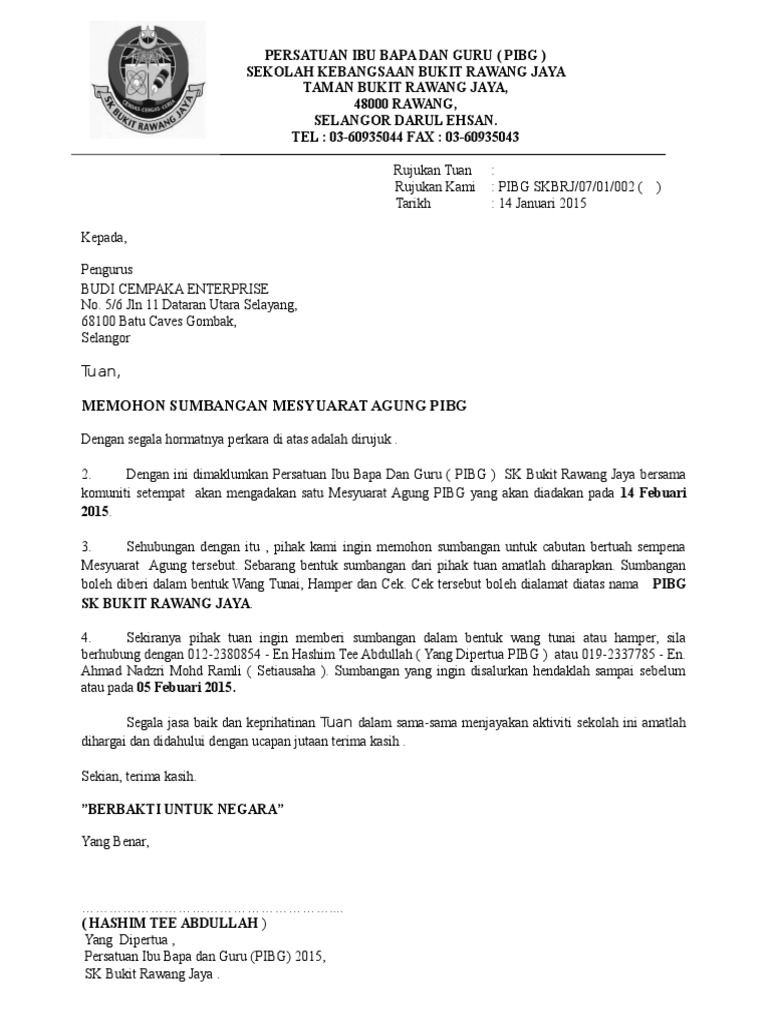 Surat Permohonan Sumbangan Pibg Fasranswer. Contoh Surat Mohon Sumbangan Barang have a graphic associated with the otherContoh Surat Mohon Sumbangan Barang In addition it will include a picture of a sort that could be seen in the gallery of Contoh Surat Mohon Sumbangan Barang. 07- 2359678 Murid Di dahulukan Pencapaian Di utamakan Ruj.
