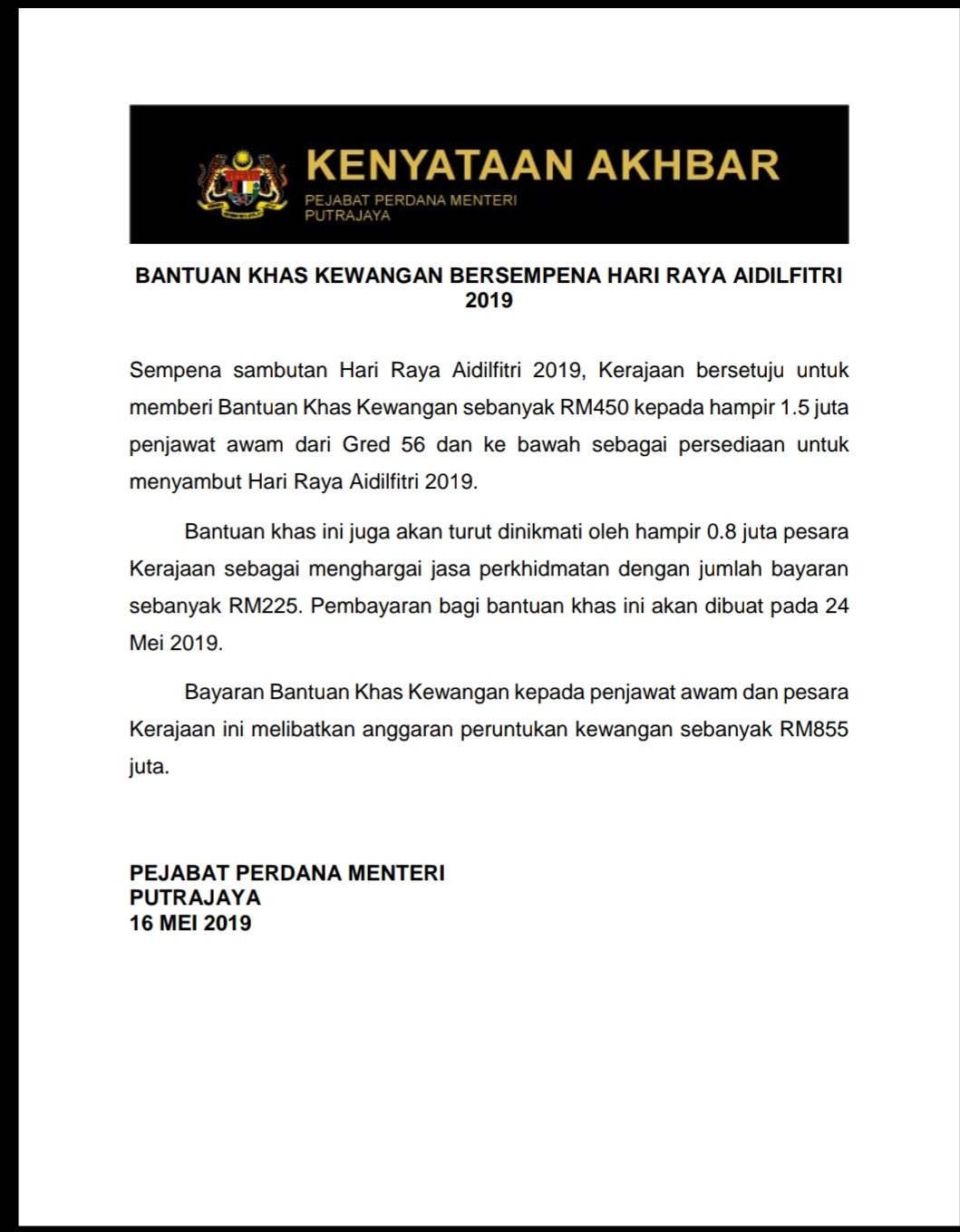 Kerajaan telah memutuskan supaya Bantuan Bayaran Khas Tahun 2021 dibayar kepada pegawai Perkhidmatan Awam Persekutuan di Gred 56 dan ke bawah yang masih berkhidmat pada 25 Januari 2021 sebanyak RM60000 dan turut dipanjangkan kepada pesara Kerajaan sebanyak RM30000. Putrajaya Umum Bantuan Khas Hari Raya Buat Dua Juta Penjawat Awam Pesara. Perodua HQ - Accessories Centre.